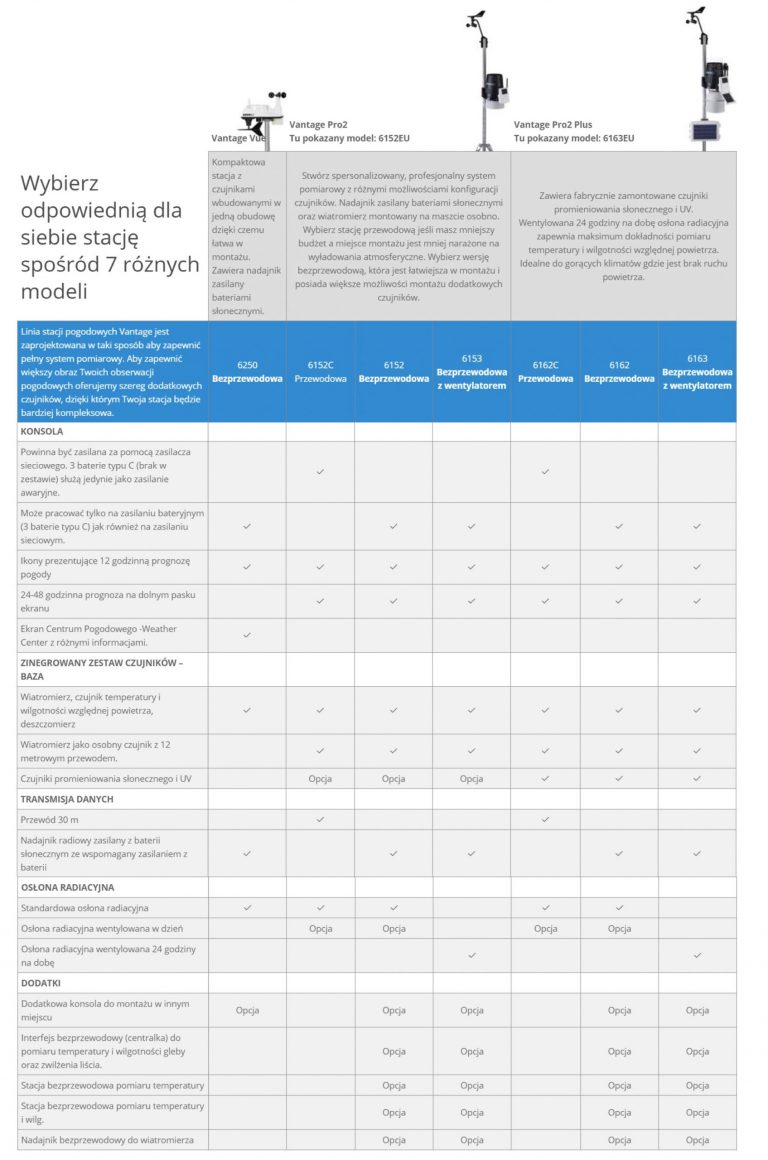 Bezprzewodowa stacja meteorologiczna Vantage Pro2 – 6152 EU. Wersja podstawowa. Umożliwia pomiar m.in: temperatury i wilgotności powietrza, ciśnienia atmosferycznego, siły i kierunku wiatru, opadów deszczu.